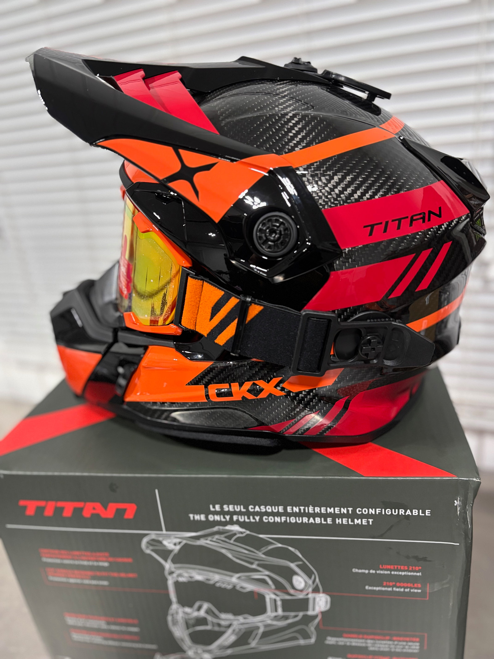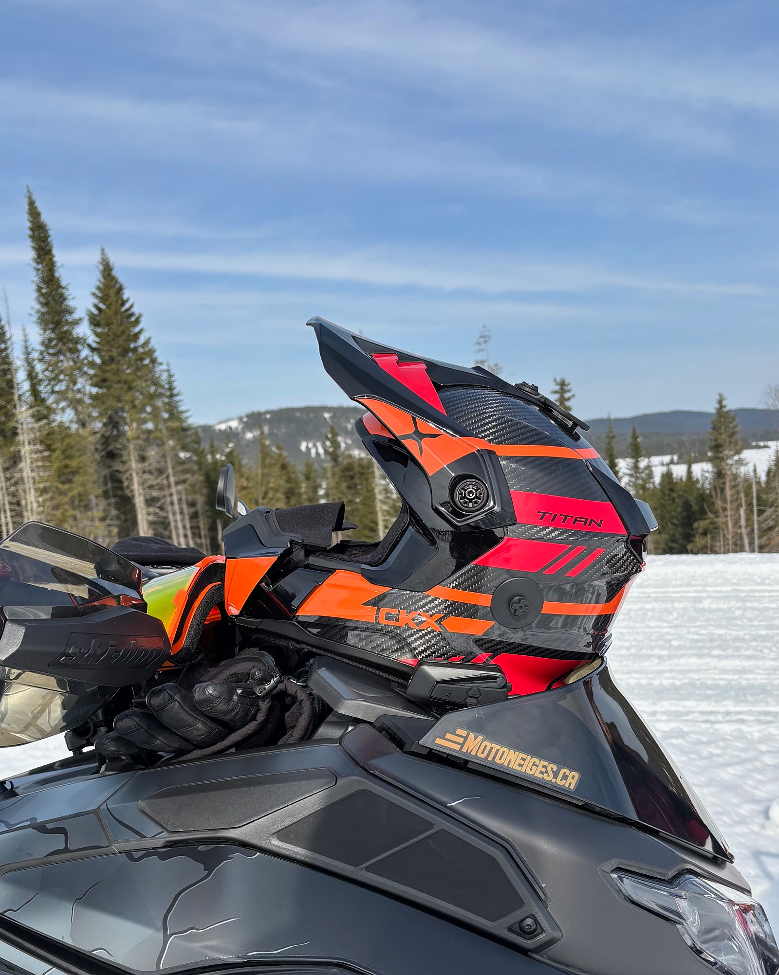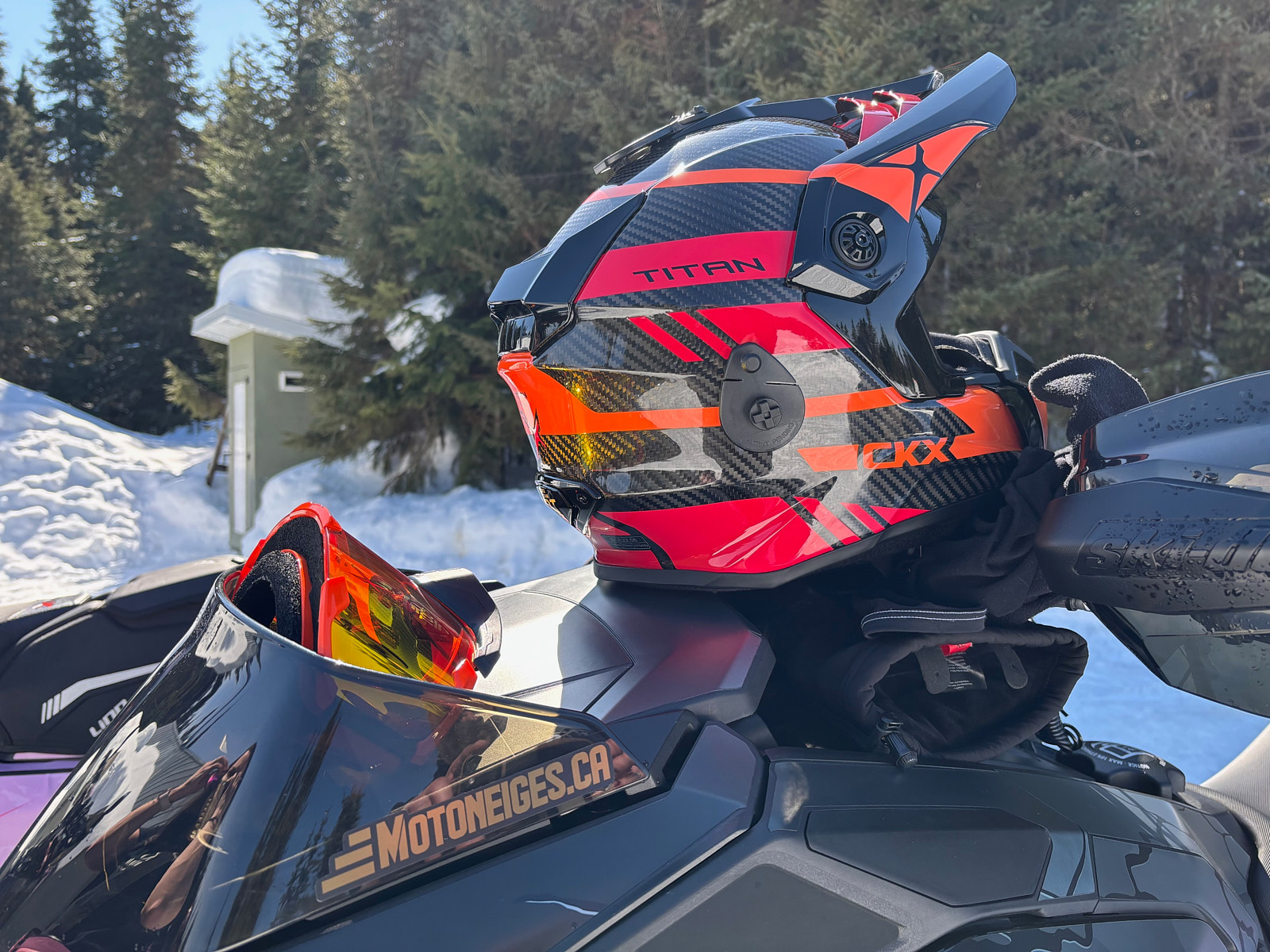 ToggleJe connaissais son existence depuis de nombreuses années. J’en entendais parler, mais jamais je n’avais encore osé l’essayer. En 2016, CKX créa littéralement une révolution dans les casques modulaires. Avec son concept de mentonnière amovible, Kimpex a su apporter un vent de renouveau pour les amateurs de sports motorisés hivernaux. Personnellement, j’ai une affection particulière pour les casques. Outre leur look, j’aime les essayer, évaluer leur confort, leurs fonctionnalités et surtout : Leur niveau de protection. L’hiver dernier, quand l’occasion m’a été présentée de faire l’essai du CKX Titan, disons qu’ils n’ont pas eu à me tordre un bras. Le soir même, je choisissais mon casque. J’ai opté pour le modèle standard plutôt que le modèle Air Flow, puisque je prévoyais de l’utiliser en sentier et non en hors-piste. Malgré tout, je lui réservais tout de même un test un peu différent. Mon cœur s’est rapidement arrêté sur le modèle carbone, rouge et orange lustré. J’adore la fibre de carbone. Non seulement pour son look très particulier, mais également pour sa légèreté. 100 g en moins peuvent être un avantage à la fin de la journée.