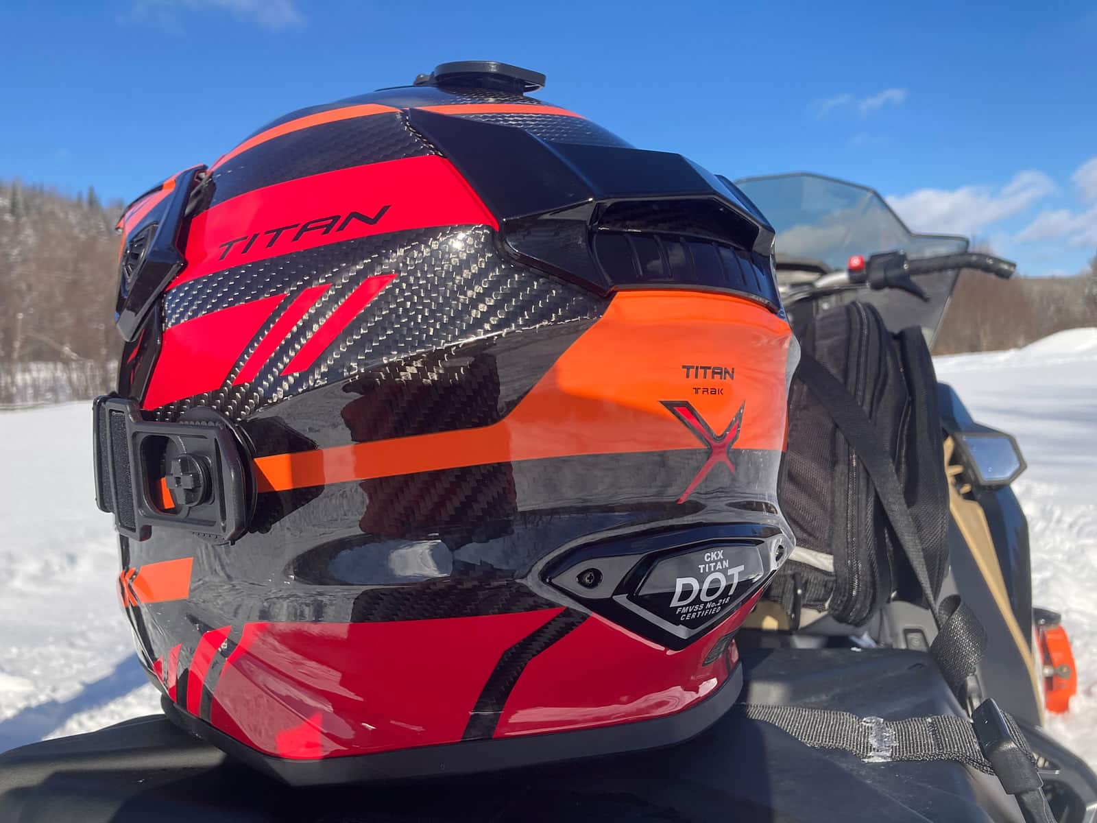 Le casque sélectionné pour 2025 est un CKX Titan Original Carbon, taille XL, de couleur carbone avec des accents rouges et orangés brillants. Ce Titan est la version Trail and Backcountry Trak — lunettes 210 ambre à double lentille incluse. Le Titan n’est plus une nouveauté chez CKX, mais il demeure très reconnaissable et adopté par de nombreux motoneigistes.