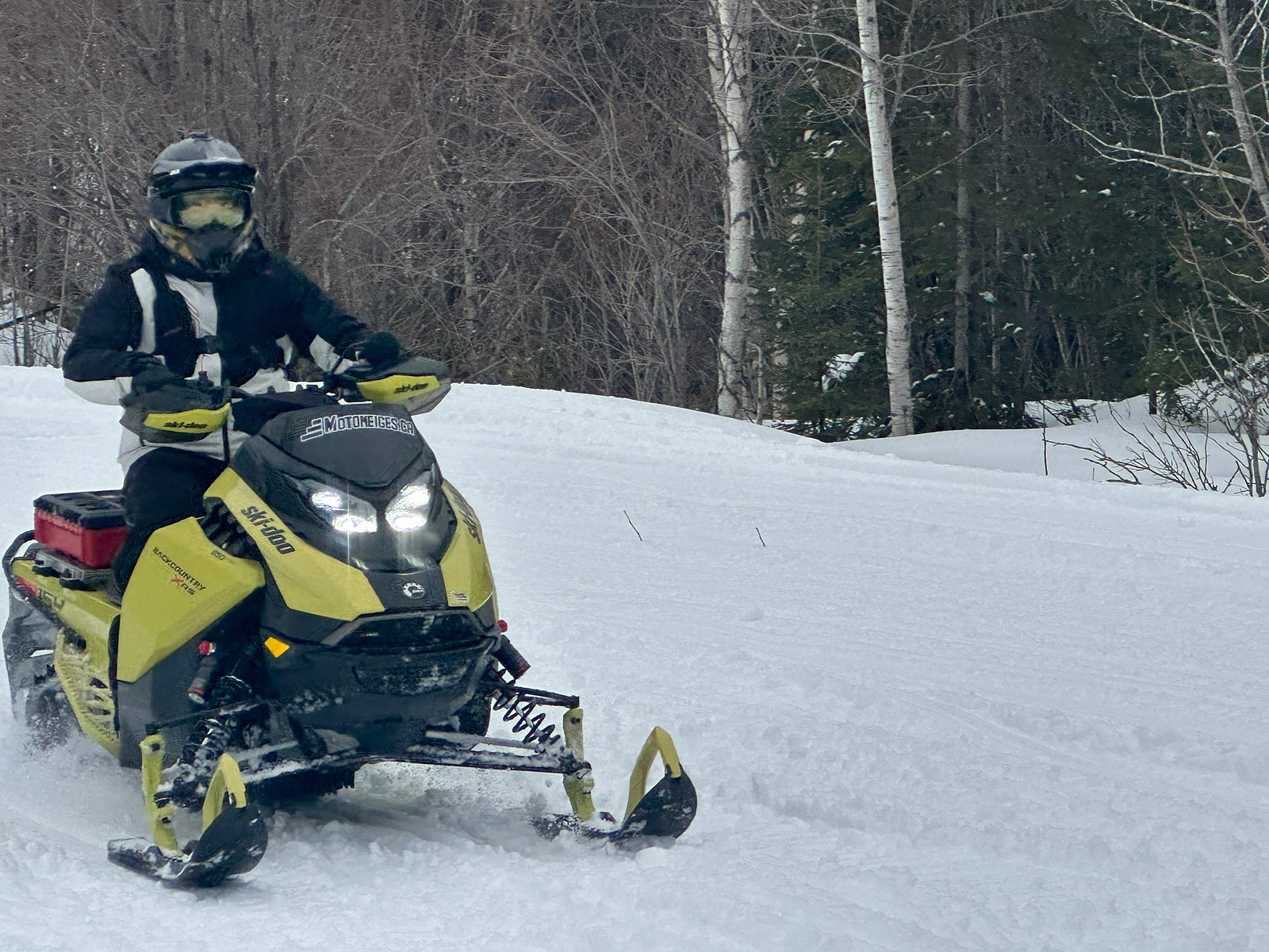 Cet hiver, j’ai eu la chance de mettre à l’épreuve la tenue complète 509, composée du manteau isolé R-200 Crossover, de la salopette isolée Powerline, du FZN LVL 1 Party Suit, des gants Free Range et des bottes Saber Single BOA. J’ai fait mes essais en Gaspésie, autant en sentier qu’en hors-piste, dans une belle variété de conditions. J’ai roulé sous des tempêtes de neige intenses où chaque mouvement compte, mais aussi lors de journées plus clémentes en fin de saison, avec des températures autour de 5 °C. Au plus fort de l’hiver, le mercure a plongé sous les –20 °C, ce qui m’a permis de mesurer la performance de la tenue autant dans le froid mordant que sous un temps plus doux.