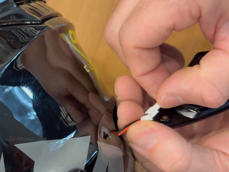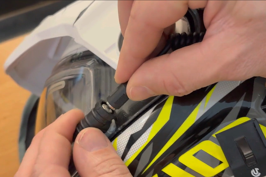 - Connectez maintenant le bloc d’alimentation du Blizzard Buster à la prise de la visière chauffante. Cela fera passer l’alimentation à la fois à la visière et à la lumière.