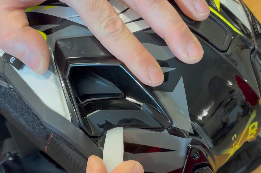 - Assurez-vous d’abord de tempérer votre casque. Pour que l’adhésif et les surfaces se fixent correctement, chauffez-le légèrement jusqu’à une température corporelle.